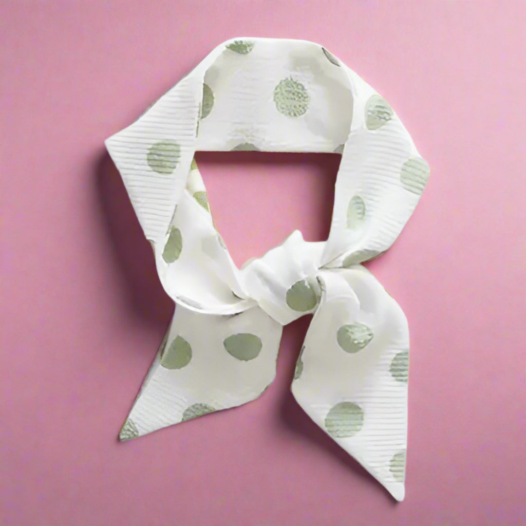 Add a playful touch to your outfit with our charming Retro Skinny Neck Scarf. Featuring a whimsical polka dot pattern in green on a white background, this accessory exudes vintage elegance with a modern twist. Made from a soft and stretchy blend of 97% polyester and 3% spandex, it offers both comfort and versatility.