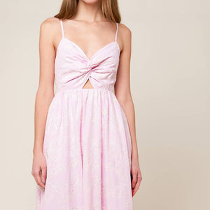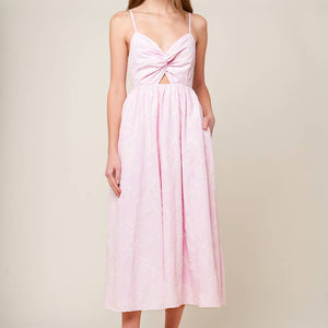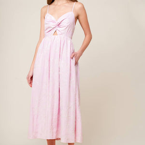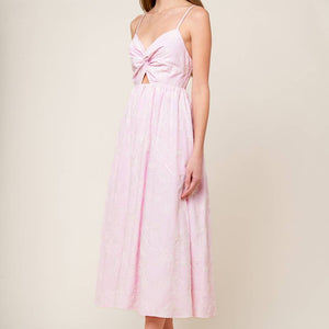 A pink textured woven midi dress featuring sweetheart neckline, front twist with cut out, straps and smocked back bodice.