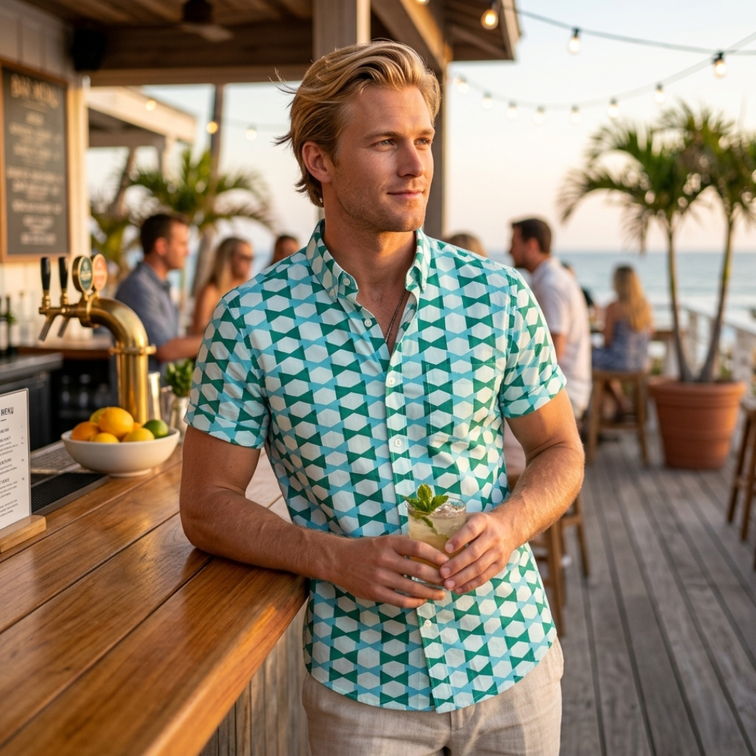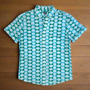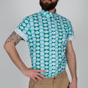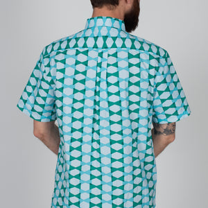 Just in time for all the tiki pool parties! The Harvey Men's button-up shirt is a lightweight cotton novelty print in blues and green.