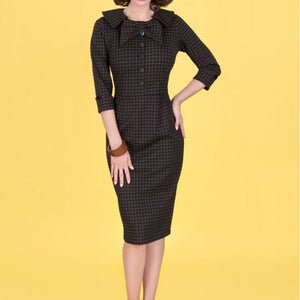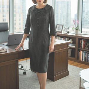 A timeless, tailored sheath dress with a subtle check pattern, featuring a soft rounded collar, button-front detail, and elbow-length sleeves. Designed to flatter with a clean, mid-century–inspired silhouette that transitions effortlessly from office to evening.