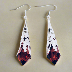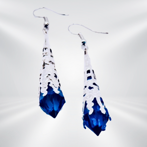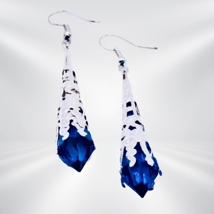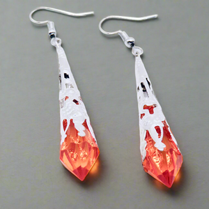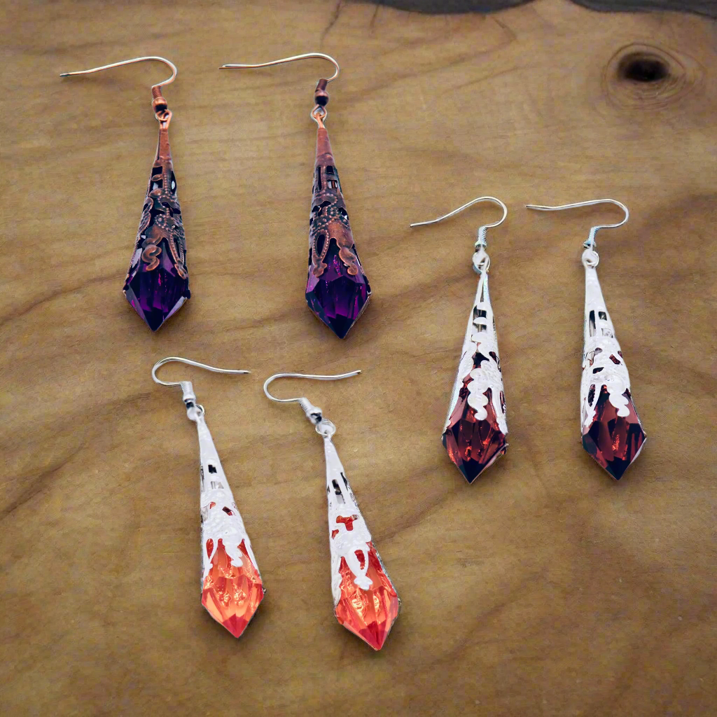 Elegant filigree metal tips house three vibrant crystals, each radiating its own unique charm. Choose from a warm Brown crystal set in silver filigree, a vivid Orange crystal also encased in silver filigree, or a rich Dark Purple crystal nestled in luxurious gold filigree.