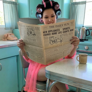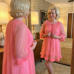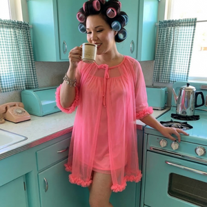 You’ll be the belle of your bedroom in this over-the-top vintage-inspired sleep set. The lightweight sleeveless nightgown has a scoop neckline with a far-out mid-shift silhouette, pair that with the playful 1960’s mini length robe and you're ready to lounge in true vintage style. We could have stopped there but we like a to give a little extra... We have decided our nightgown needed a matching playfully sexy sheer robe with ruffle detail to give it that ultra-feminine touch.