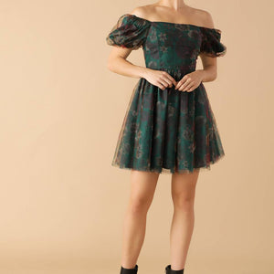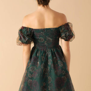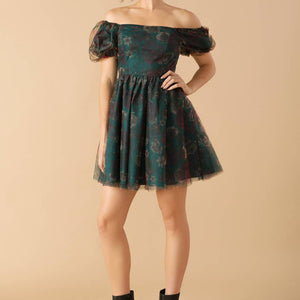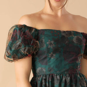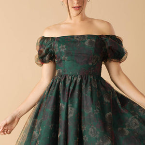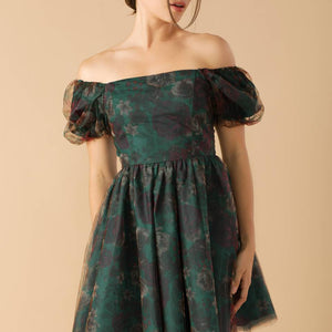 A printed woven organza dress featuring off shoulder neckline, short puff sleeve, full skirt and back zipper closure