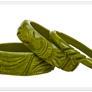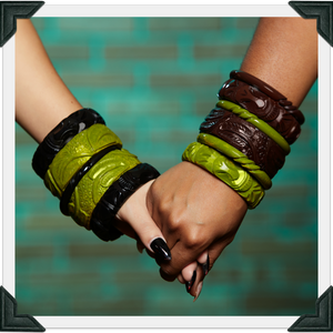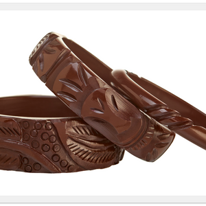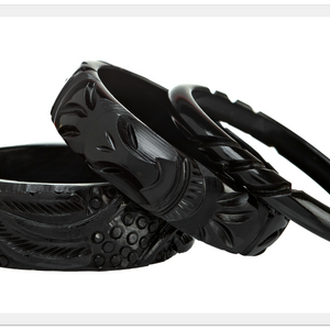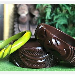 • This new Collection features bracelets that are very weighty and highly-carved.  They're just like your favorite Bakelite bracelets but Tiki!