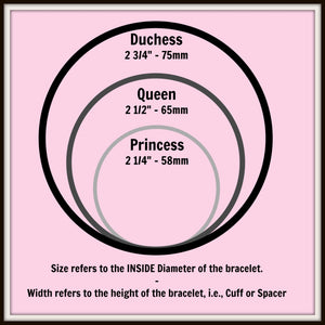 This new bracelet is available in the following sizes:   Queen (2 1/2"  or 65mm inside diameter) and Duchess (2 3/4" or 75mm  inside diameter).