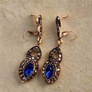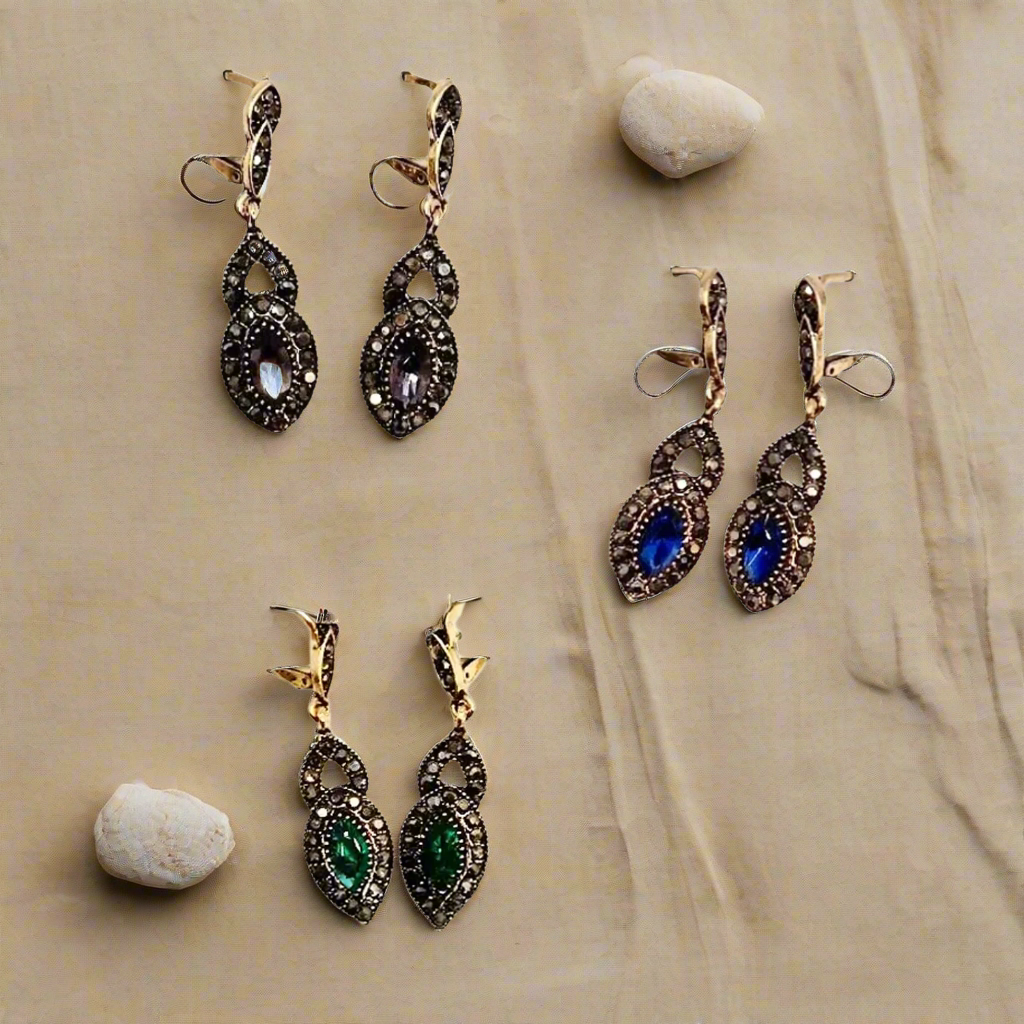 Elevate your vintage-inspired look with these stunning rhinestone earrings. Crafted from durable alloy metal, these earrings are a dazzling statement piece available in three rich colors: dark purple, vibrant blue, and luxurious emerald green. Each earring features a large, colored rhinestone at its center, surrounded by dark grey and black stones that add a touch of drama and sophistication. Measuring approximately 1 ¾" in length and just over ½" in width, these earrings are the perfect size to make a bold yet elegant impression. Whether you're dressing up for a night out or adding a touch of glamour to your everyday attire, these earrings are the perfect accessory to complete your vintage-inspired ensemble.
