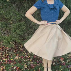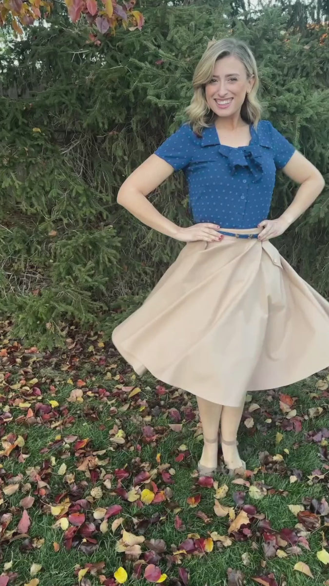 In a lightweight navy dotted Swiss fabric, the Bonnie blouse offers a perfect blend of comfort and style. With its short sleeves and button-front closure, it provides a timeless silhouette that embodies the fashion of the 1950s.