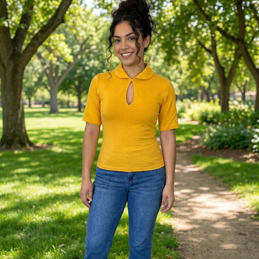 Our Keynote Blouse is a vintage-inspired staple that blends timeless elegance with modern comfort. Featuring a flattering keyhole neckline, a classic Peter Pan collar, and half sleeves, this blouse exudes retro sophistication. The Keynote Blouse is as versatile as it is stylish. Perfect for pairing with high-waisted skirts or trousers, this top transitions effortlessly from day to night. Whether you're dressing up for a special occasion or adding a touch of vintage flair to your everyday look, the Keynote Blouse is a must-have for any retro wardrobe.