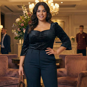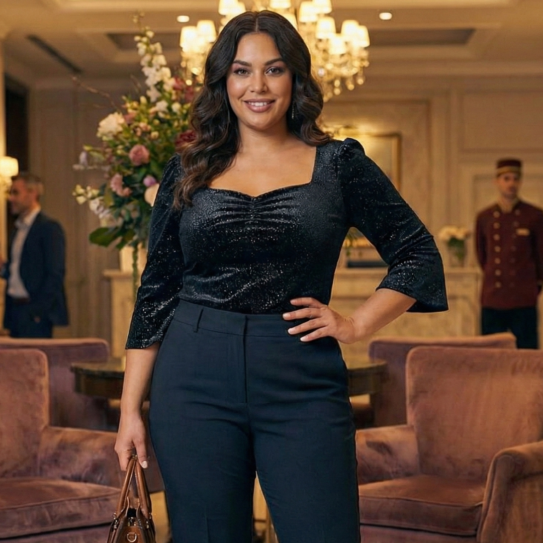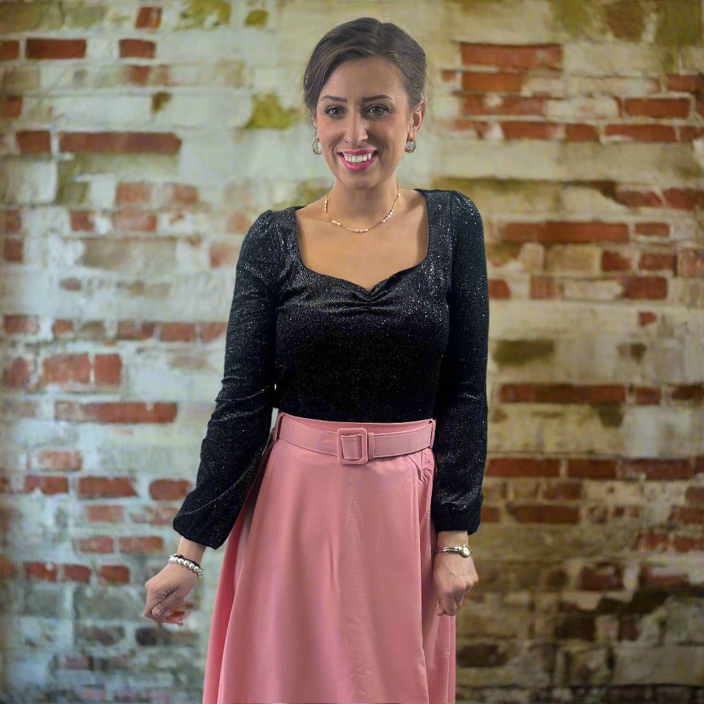 The Vivienne Vintage Top is a perfect blend of classic charm and modern glam. Featuring a flattering sweetheart neckline with a gathered bust, this top enhances your silhouette effortlessly. The long cuffed sleeves add a touch of sophistication, while the comfortable pull-on design ensures easy, all-day wear. Crafted in a stunning black fabric with a subtle sparkle, this beauty pairs perfectly with skirts or trousers for a chic, vintage-inspired look.